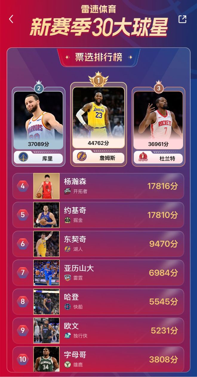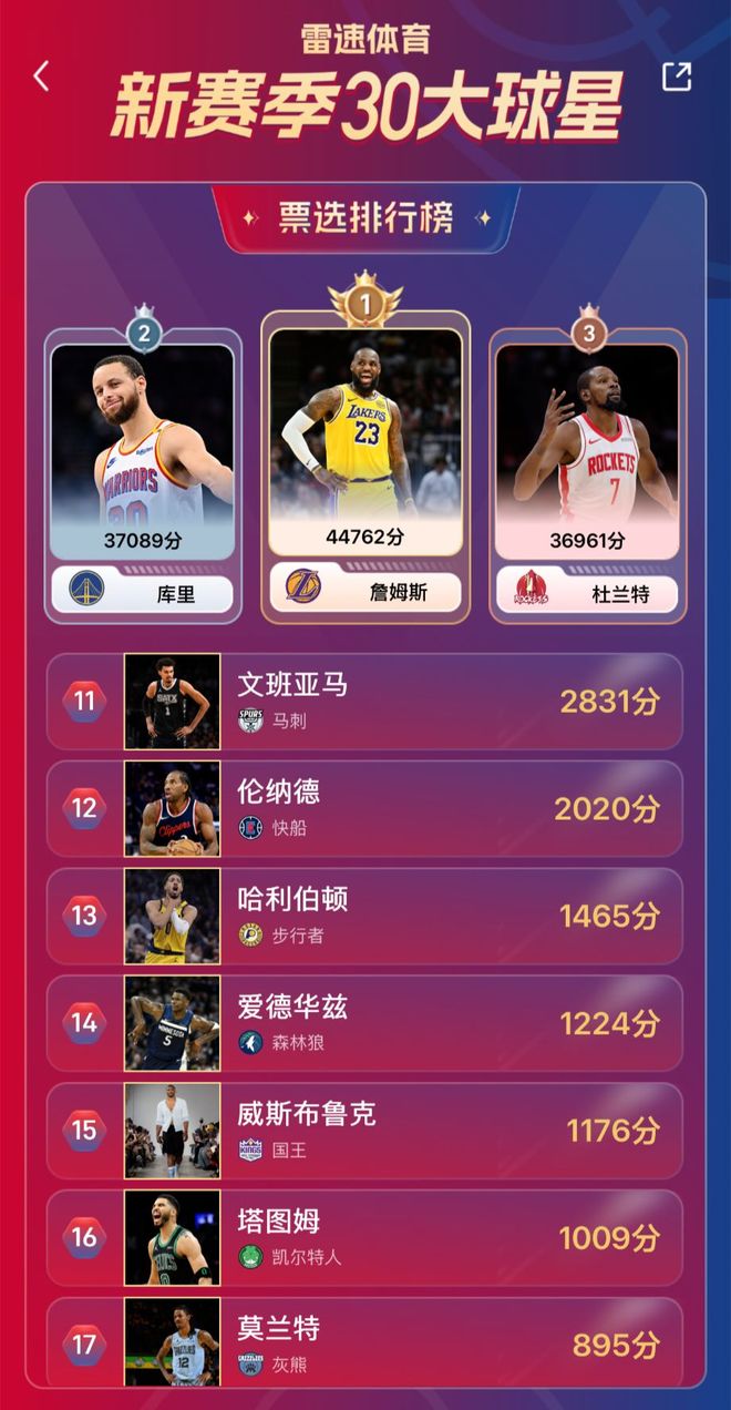 目前雷速NBA新賽季30大球星排名結果如下: